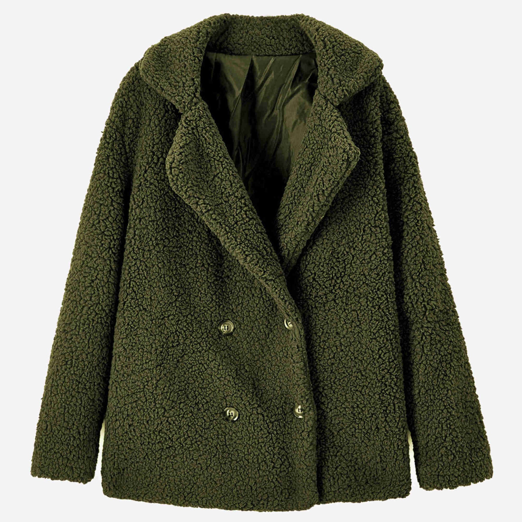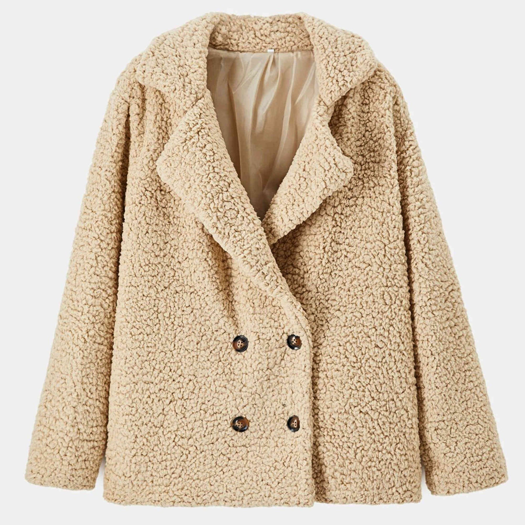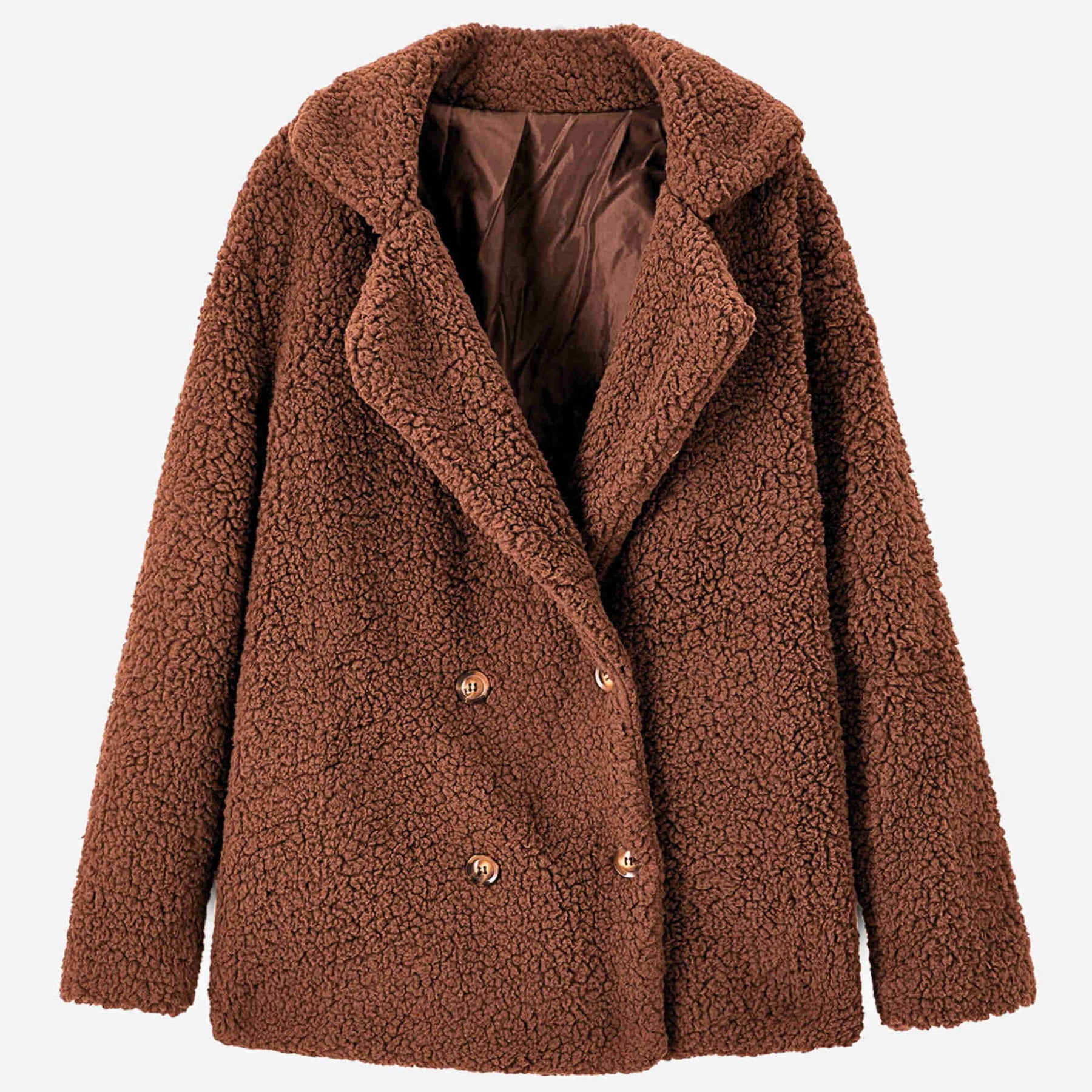 This Women Double Breasted Teddy Coat has a rich textured fabric that feels plush to the touch, with a cut that drapes naturally for all-day comfort. Its double breasted front adds a subtle structure, paired with a wide collar that frames the face.